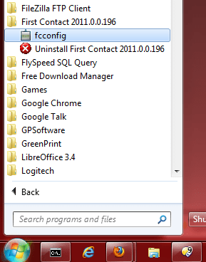 - Open the FCConfig utility by clicking your Windows Start button, then Programs, then the First Contact 2010.x.x (the number depending on the version installed).